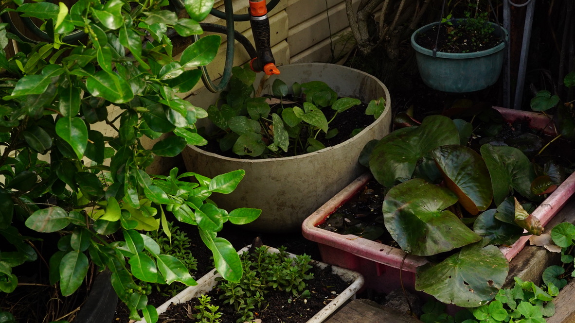 Looking around at the dirty tub filled with tadpoles, I noticed how she was growing Rice Paddy Herbs, doing cuttings of Pothos, orchids and Kaffir Limes as well. It seems that this random assortment of Asian herbs, citrus trees and ornamental plants are coexisting with local frogs. Maybe you don’t need completely intact or undisturbed landscapes within the sprawling suburbs to have a rich communities of plants, animals and people.