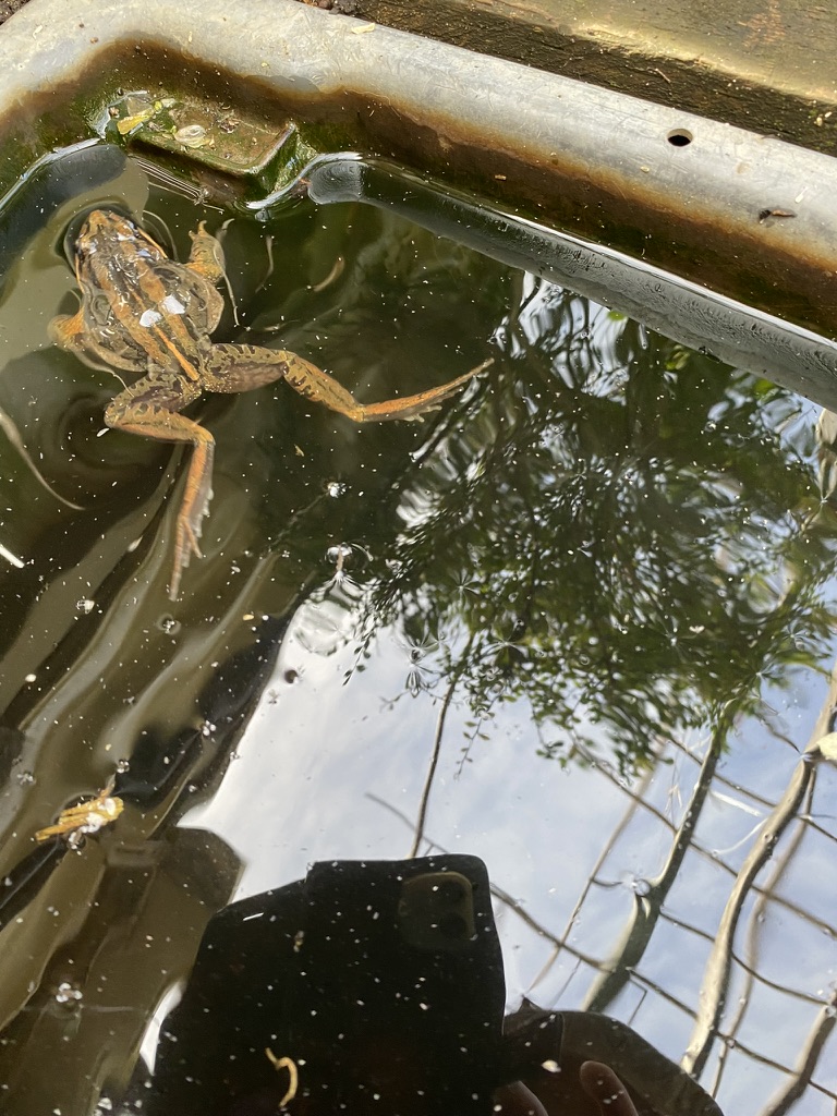 She  put the frog into a plastic tub she was growing her water lillies in and recorded two short videos on her phone. Sometimes in the afternoon she would hear it making a call like someone ‘knocking on a piece of wood.’ She hadn’t heard the calls recently, but when she showed me the tub, we found lots of new tadpoles.